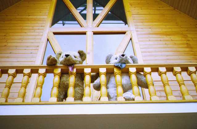 クマ(テディベア)自ら看板に 枚方パークにて、テディベアの専門店の小屋がありました。ふと入り口を見上げると看板代わりに二匹のテディ・・・。粋な飾り付けです、当日、少し雨が降っていたのが気になります。