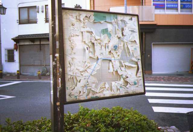 花博案内地図(市内) 京阪電鉄・森小路駅前、これはかつて花の万博が開催されていたとき、訪れた人たちを会場に導くための重要な道案内でした。今では地図そのものが古文書のように劣化して、モダンアートのようになっています。