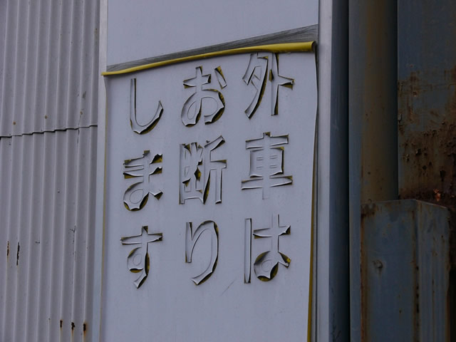 結果的に凝った表現 京都市内、こういう雰囲気になるまでにかなり時間が必要だったのではないかと想像します。おそらく赤とかの原色のテープで文字が書かれ、何年か経って上からペンキが塗られ、更に年を経てペンキの劣化とテープの材質の収縮でこのような姿に・・・。 結果的に、作者の意図とはかなり違うところで凄く効果的なものになったようです。