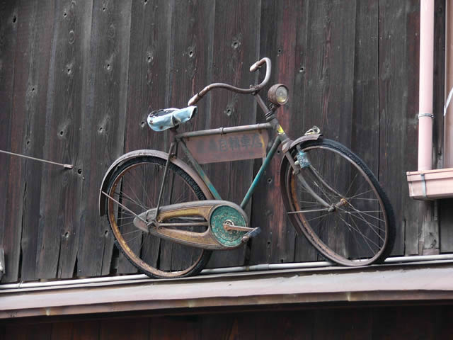 とことん使う 京都市内。左甚五郎の「忘れ傘」というのが確かあったと記憶していますが、自転車でもそういうのがあるのかな・・と思いました。軒の上に乗っている自転車。字がかなりかすれていますが自転車屋さんの看板でした。渋いです。