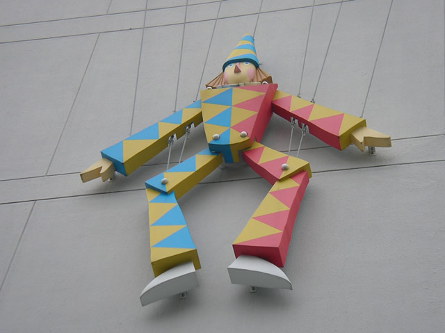 動きは平面的 玩具博物館だそうです。建物の壁面に巨大なマリオット、動くのでしょうか? 動くとしても関節やワイヤーの様子から構造的に平面なアクションに限定されるのではないかと思ってしまいます。