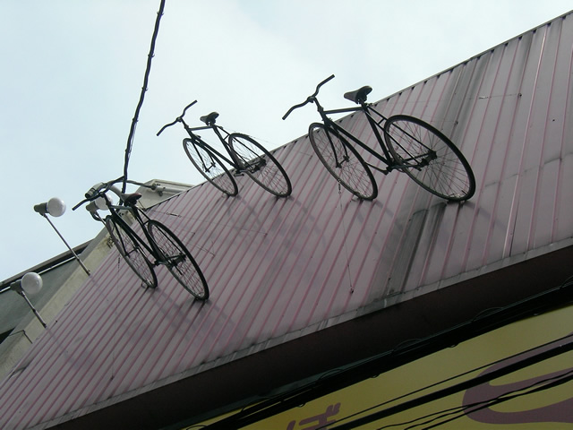 自転車屋さんの看板には実物の自転車がよく使われるみたいです。壁面無人レース。