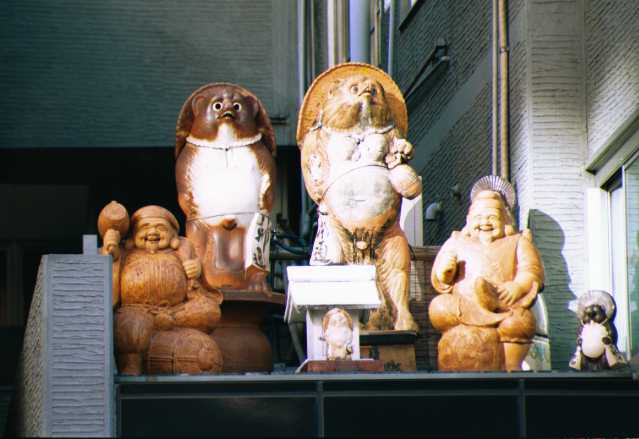 ある陶芸品店(市内) これは陶芸品店の屋根に看板として置かれている神々(?)です。写真だけを見るとびっくりしますが、その場で見るとすぐに看板であることが理解できます。それにしても豪華な取り合わせです。いずれアングルを変えて撮影しようと思っています。