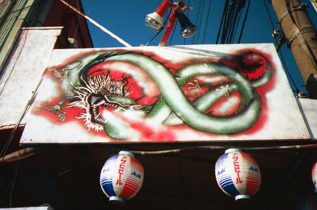 エアブラシドラゴン JR星田駅の近辺にある中華料理店です。エアブラシの技法を使って描かれたと思われる竜。偶然か意図した物か不明ですが、ふわっとした感じと恐ろしい形相のコントラストが、この世の生き物ではない竜の一面をうまく表現しているみたいで面白いです。