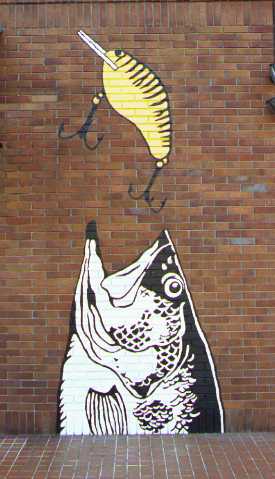 ルアー JR横浜駅近辺にて。歩いているといきなり視界に飛び込んできました。有名な釣り道具やさんなのでしょうか、壁面に力強く描かれていました。シュールです。