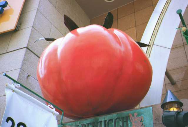 吹田市、江坂。イタリア料理店でしょうか、目立つ看板です。巨大なトマト、よく熟れているみたいな質感です。つついてみたくなります。