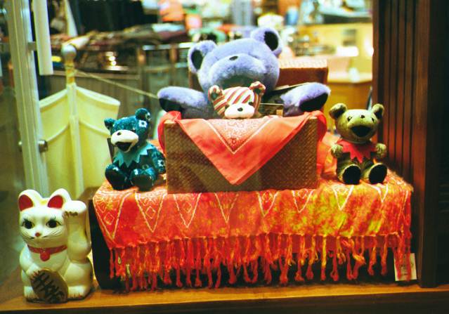 競演 天保山、海遊館のあたり。どうしてもぬいぐるみが飾り付けてあるショウウインドウに目が行ってしまいます。歌っているみたいなクマ、別枠みたいな招き猫、楽しげな雰囲気がいいです、でもここが何のお店だったかは思い出せません。