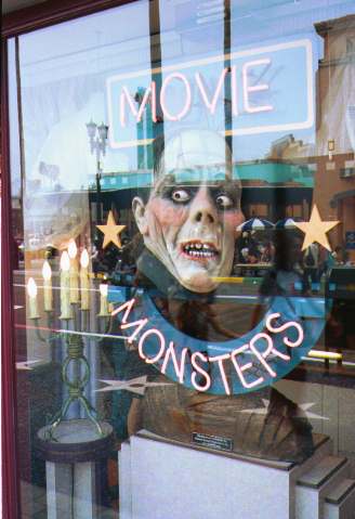 エンタテイメントに徹する USJにて。モンスター系グッズの専門店です。ガラスに反射する風景の間から睨みをきかせるフランケンシュタインの怪物・・・・。うまくできています。そういえば、古〜い恐怖映画、子供の頃日曜映画劇場なんかでもやっていました。モノクロ画像だったのがよけいに怖さを盛りたてていました。確か、ボリス・カーロフとかいう役者でしたか。フランケンシュタイン役の名優でした、本当に怖かったです。