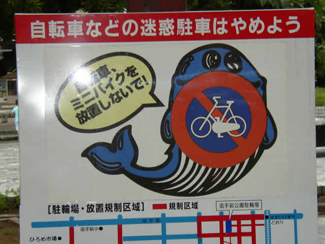 鯨の警告 高知市内にて。 高知市内には鯨をモチーフにした看板・キャラクターなどを多く見かけます。駐輪禁止の看板にも登場しています。こだわりの土地柄なのでしょうか?