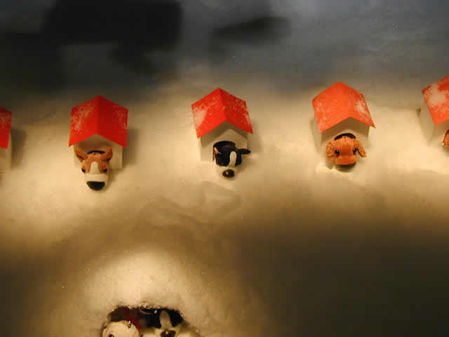犬の集団 大阪市内、梅田地下街にて。 雪の中の犬たち。単純な造りのデコレーションですが、スポットライトの効果で冬の夜の感じが出ています。何か物語があるみたいです。