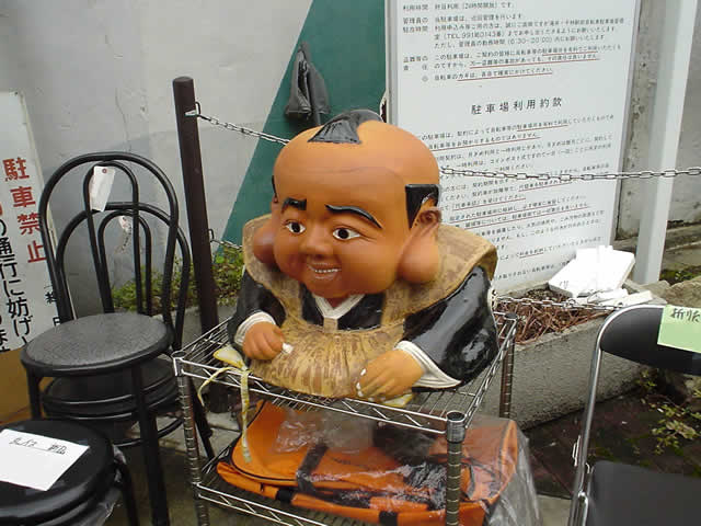 キャビネットの福助 大阪市内、千林商店街のあたり。あるリサイクルショップの前に並べられている商品。その中で一際目立つ存在の福助像。たぶんこれも売り物なのでしょう。でも、もはや商品というより用心棒といった雰囲気です。