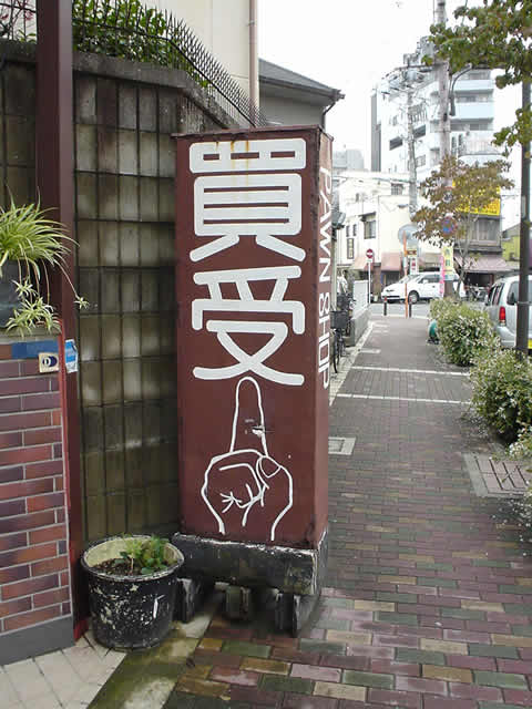 手を広げて見せて欲しい 大阪市内、千林商店街のあたり。ある質屋さんの看板。単色で描かれているにもかかわらず強烈なインパクトの人差し指です、見ていると落ち着きません。 この手、もしパーに開くことができたらどんな風なのでしょう。ちょっとした恐怖が伴います。