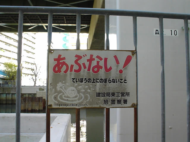 ネガの画像 大阪市内、城北川の遊歩道にて。川に入らないように注意している看板です。溺れている人物の部分は既に塗料が落ちています。どういう化学反応なのかその部分だけ土・ホコリなどがくっつきにくくなっているみたいです。結果として再び人物の形が薄っすらと白く浮かび上がる・・・・。あちらの世界から注意されているみたいで更に看板としての価値が上がっているみたいです。