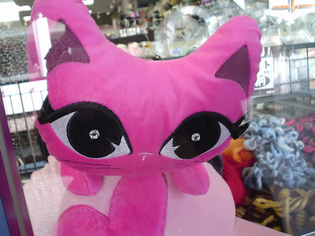 鋭い視線 りんくうプレミアムアウトレットにて。年末のアウトレットショップはかなり混雑していました。こういうときは人の流れに流されて歩くことになります。人と人の間からショーウインドウが途切れ途切れに見えます。急に目の前に出てきた猫のぬいぐるみ。素朴な作りですが大胆に見開かれたデザインの目は鋭い視線を感じさせます。