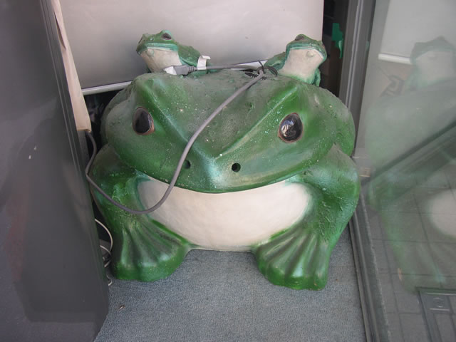 パワーラインのカエル 滋賀県 京阪浜大津駅の近辺にて。あるビルのショーウインドウ、隅っこに置かれていますがしまい込まれているわけでもないカエル。背中には二匹の子ガエル(?)と引っこ抜かれた電源コードを背負っています。電力を投入されるとどのような機能が発揮されるのか気になります。