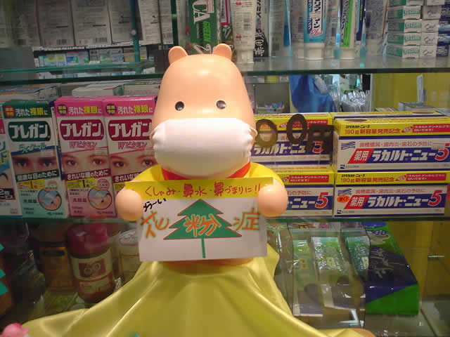 カバ 大阪市内 京橋のあたりの薬局。マスコットのカバ君、マスクをして重装備です。人形劇の舞台のような雰囲気でかわいいのですが花粉症が何かに効くみたいな書き込みが気になります。
