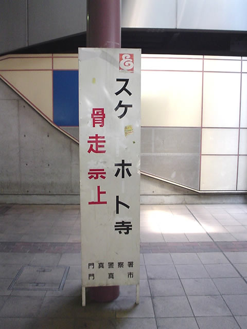 スケホト 大阪府 門真市駅のあたり。スケートボード禁止の看板。文字の部分部分がテープの様にはがれやすいのかかなり妙な感じになってしまっています。このいたずら、決してほめられるものではありませんが、日本は表意文字の国であることを思い出させてくれます。