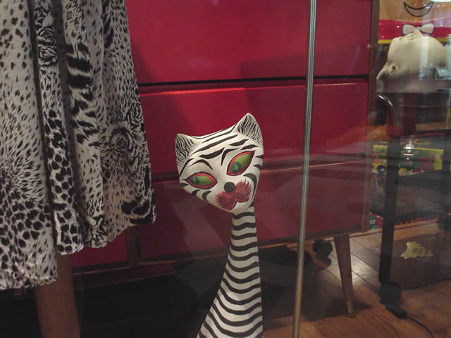 視線 大阪市IMPビルにて。なんとも独特のキャラクターの猫です。トラ猫・・・。幾何学的な縞模様、眉毛になったりしています。緑の瞳が見ているのは豹の柄でしょうか。