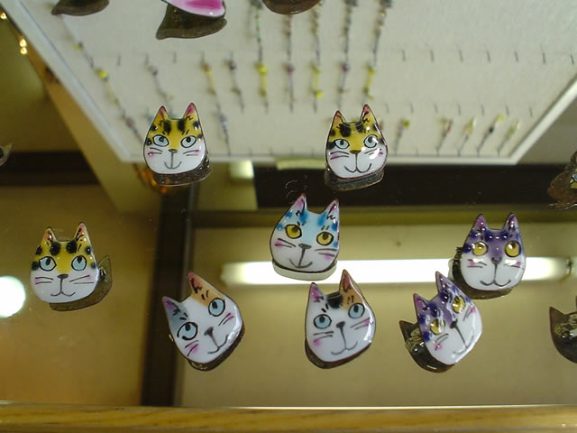 猫の視線 京都 嵐山のおみやげ屋さんにて。鏡の上に猫のブローチが並べてありました。手書きなのか同じものは二つとありません。ちょっと宙に浮いたような不思議な猫たち。カメラ目線ではありませんが私の後ろにいる何かを見ているようです。