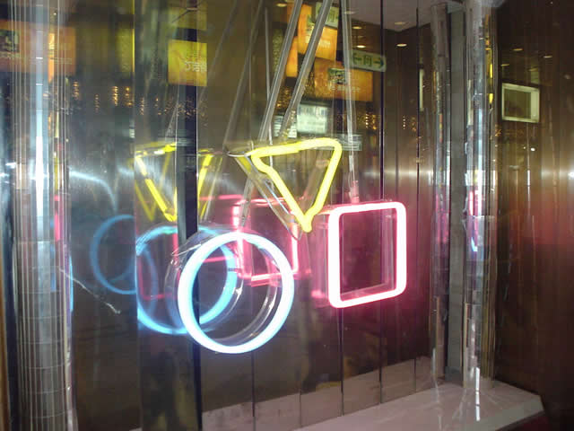 光る揺れる○△□ 大阪市、梅田、阪急百貨店のあたり。壁面にこういうディスプレイがありました。ネオンでしょうか?三色に輝く○△□。それぞれが振り子のように軌跡を描いて揺れるだけですが、周期が微妙に違うので時間が経過するにつれて重なったり、ばらばらになったりしています。単純ですが待ち合わせなどの重要な目印になっているようです。 。
