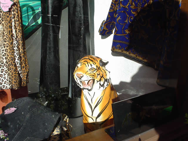 暁に吠える 大阪市旭区。朝、出勤の途中で見かけたある洋服店のショーウィンドウです。朝日が差し込んで豹がスポットライトをあびているみたいに浮かび上がっていました。陶器でしょうか、滑らかな表面の所々が光っています。この時間にしか見ることができない特別展示です。