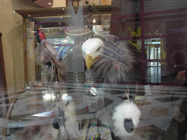 雑踏からの視線 大阪、IMPにて。アメリカ先住民族の民芸品みたいなものを売っているお店だったでしょうか。ショーウィンドウのガラスの映りこみの中から鋭い視線が放たれています。白頭鷲でしょうか、ちょっと獲物として狙われている感じがしてきます。