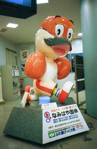 モッピー君 大阪国体のマスコットでした。足元には「僕に乗るとけがをするからあぶないよ」とかの貼り紙がしてありました。まるで、猛獣です。でも、人気のあるキャラクターだったそうです。