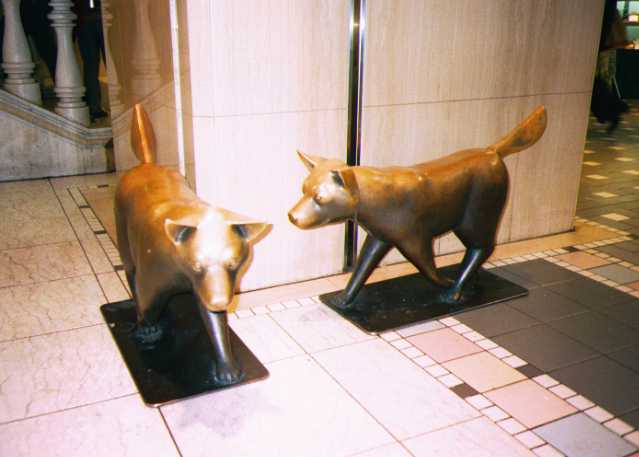 地下街の犬たち 市内・地下街にて、有名な作家の作品だそうです。全部で8匹居て全て放し飼いでしたが、最近は一カ所に集められています。この写真は、まだ放し飼いされていたときのものです。今ではこの上に座ることは出来ません。