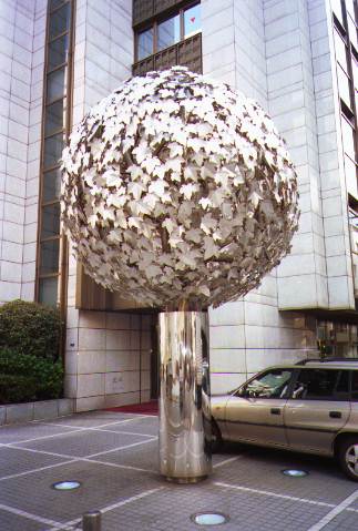 観葉彫刻 大阪市内、本町近辺。銀の葉・・ぽっかりと宙に浮いた球体。この葉っぱは風が吹いても揺れません。ビルの敷地の片隅、時間が凍結したみたいな雰囲気です。