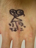 ![]() | 左手。 by Yukiko Tawara, Rina Akiyama 目と口と極太の横線3本が有希子ちゃん。何?って訊いたら布団に寝てる女の子だそうで。適当に書いて何かは後付けっぽいですが、カワイイので許します(笑)。 髪の毛と布団の縦線および「おフトン」の文字は莉奈ちゃんのアレンジです。 |