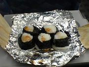 | 天むす。 1枚目の包装紙を取ったところ。ちょっと…っていうか、だいぶ過剰包装風味。 | 天むす(中身)。 写真が小さいのはレイアウトの都合です(笑)。味は別に大した事ないです。 | おまけ。 名古屋はグルーミーが流行中なのか?UFOキャッチャーの難易度は高め(汗)。 | |||||