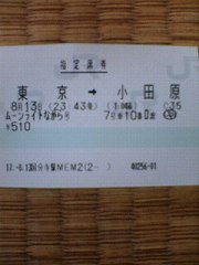 | 覚悟完了。 ムーンライトながら。お盆なので厳しいかと思ったら当日でも取れました♪ | 8/14 大阪港。 待ってろよ、ジンベエ!!ぼくの心はマックスハート。 | 天は我を見放し給うたか。 30分待ち…。出直してきます。っつーか、親子連れとカップルばっかりだよ。 | |||||