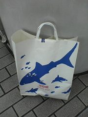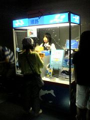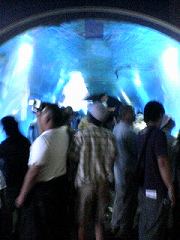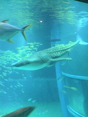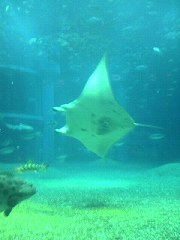 | じんべえざめ。 でかいよ。うひ〜。大きく見えないのは周りの魚もジャンボサイズだから。 | えい。 えいです。じんべえざめも好きだけど、えいはもっと好きです。 | おねぃさん(笑)。 行程半ばでカメラの物販です。さすが大阪、商売上手です。 | |||||